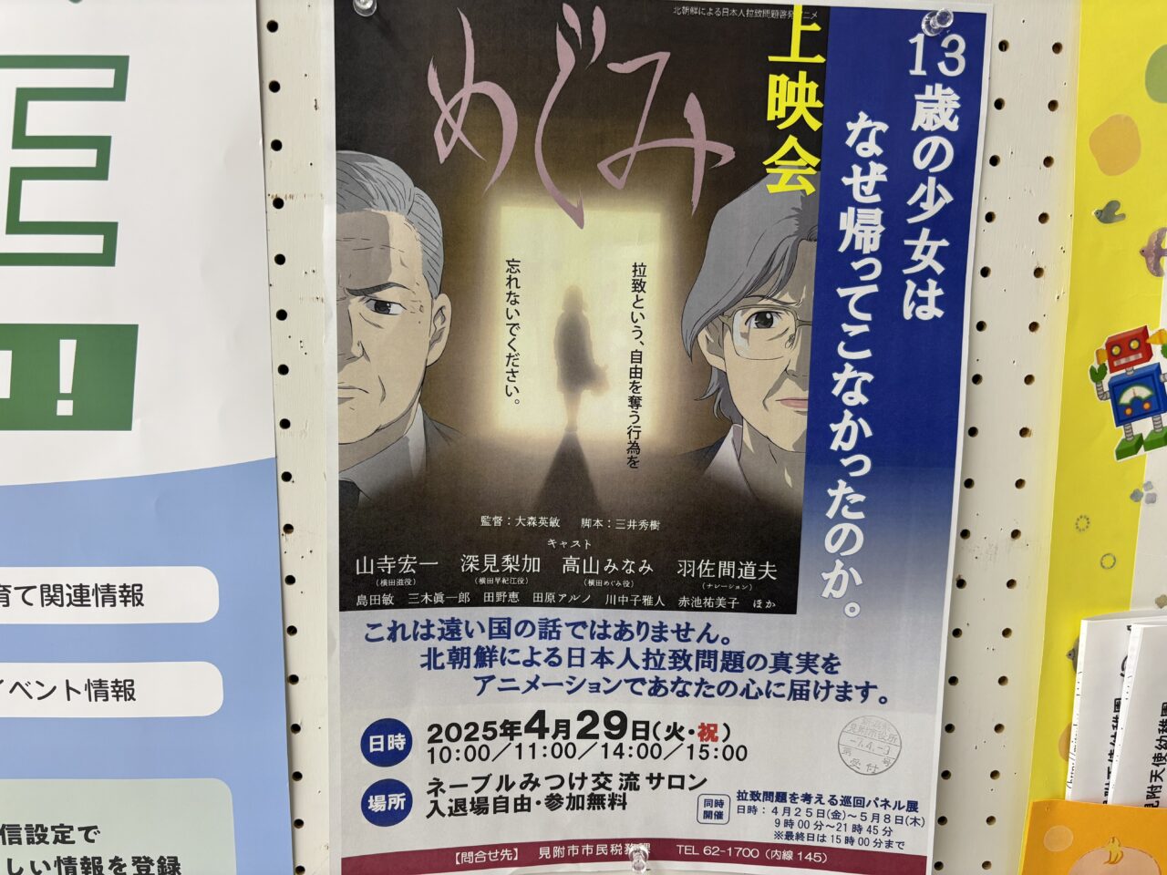 4月29日(火)はネーブルみつけの交流サロンで、拉致問題を取り上げた25分のアニメーション「めぐみ」を上映します。入退場自由、参加無料です。