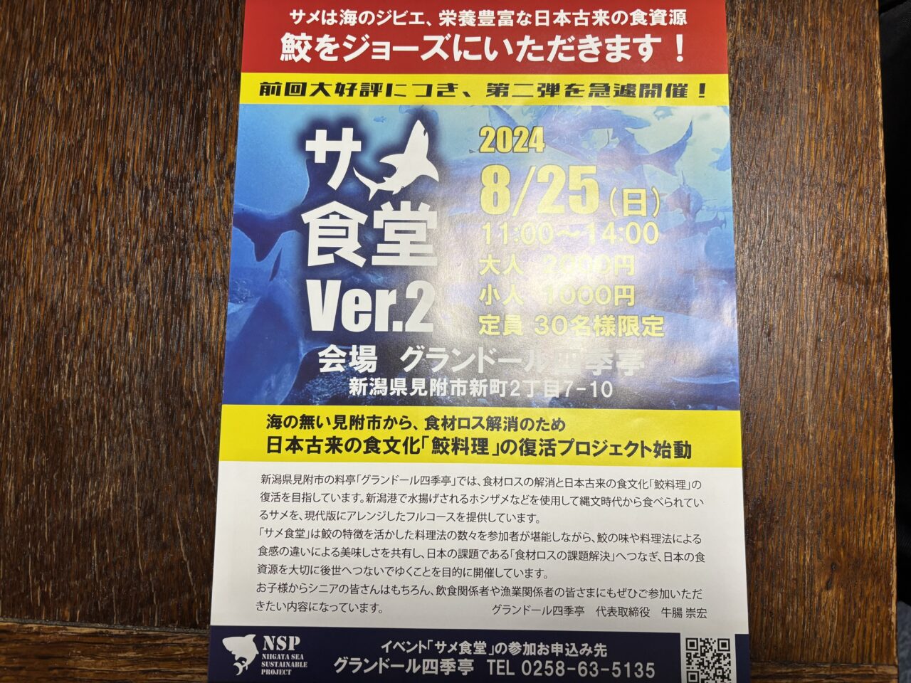 グランドール四季亭は食材ロスの解消と日本古来の食文化「鮫料理」の復活を目指したプロジェクト「サメ食堂」を開催していました。新潟港で水揚げされるホシザメなどを利用して縄文時代から食べられているサメを、現代版にアレンジしたフルコースを提供していました。