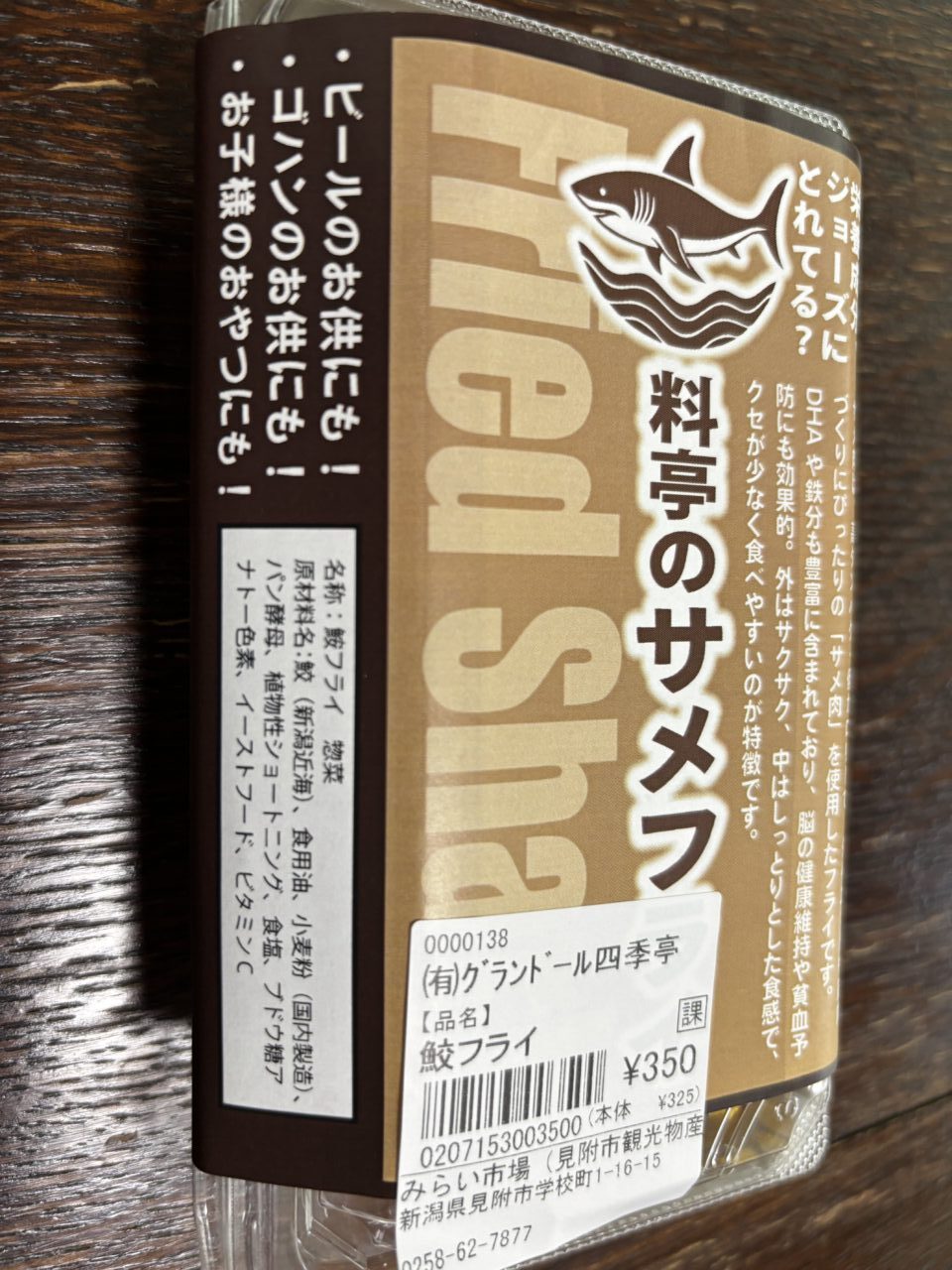 グランドール四季亭の鮫料理は、まちの駅ネーブルみつけ内の、みらい市場でも販売されていました。料亭の鮫フライはDHAや鉄分が豊富に含まれており、クセが少なく食べやすいです。