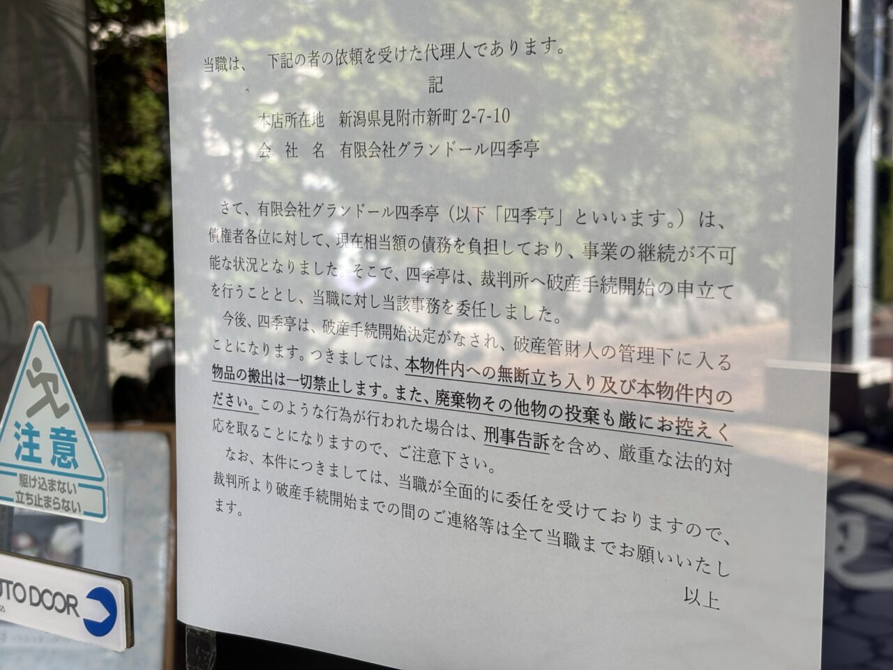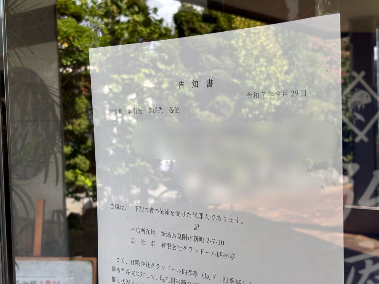 グランドール四季亭の入り口に告知書が貼ってありました。日付は令和7年年9月29日です。