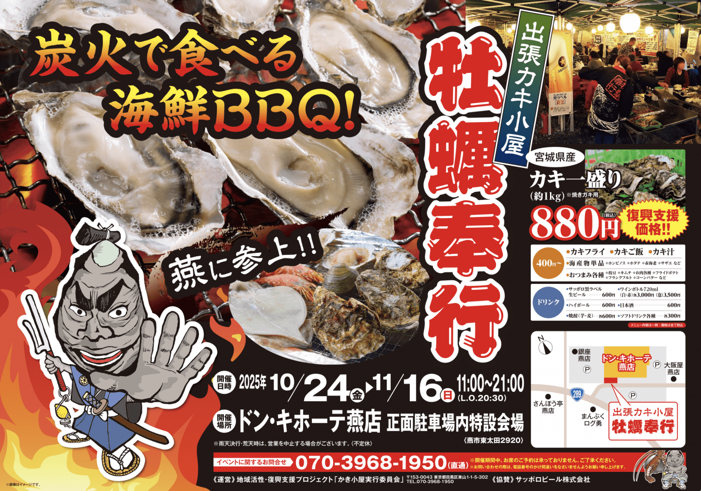 燕市 : ◆ドン・キホーテ燕店 駐車場に参上!! 10月24日〜 出張牡蠣小屋 牡蠣奉行【牡蠣奉行 ドン・キホーテ燕店】